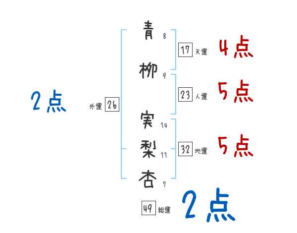 外運![]() | 青栁実梨杏さんの外運は26画の2つ星!波瀾万丈かも。信頼できる人を大事にしましょう。 生活面を象徴する運勢です。外部から受ける影響力を表し、結婚運、家庭運や職場、環境への順応性を表します。 |
