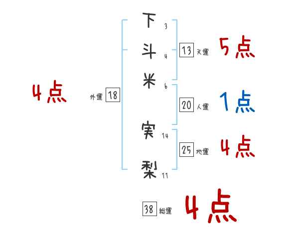 天運![]() | 下斗米実梨さんの天運は13画の5つ星!才能に恵まれ人気がある。名声を手に入れる。円満な人生。 家系が持つ宿命的な運勢を表します。祖先から受け継いだ苗字ですので自分の力が及びません。家柄を象徴します。 |