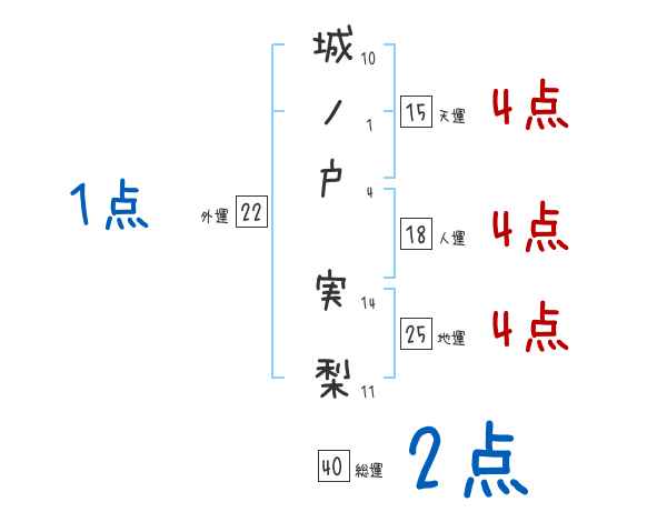 外運![]() | 城ノ戸実梨さんの外運は22画の1つ星!努力することが苦手ないっぽう手先が器用。芸術性にも優れる。 生活面を象徴する運勢です。外部から受ける影響力を表し、結婚運、家庭運や職場、環境への順応性を表します。 |