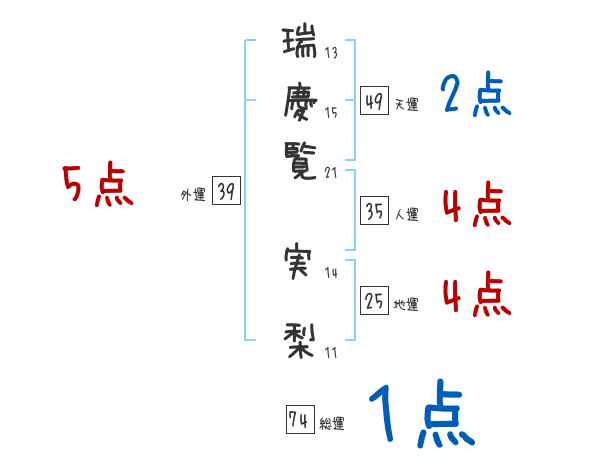 外運![]() | 瑞慶覧実梨さんの外運は39画の5つ星!社交性に優れ人望が厚い。人の上に立ち成功する。 生活面を象徴する運勢です。外部から受ける影響力を表し、結婚運、家庭運や職場、環境への順応性を表します。 |