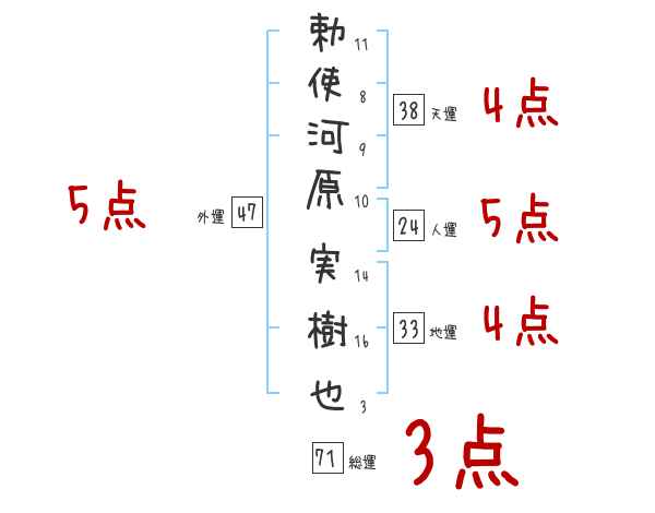 外運![]() | 勅使河原実樹也さんの外運は47画の5つ星!実力が開花し発展する円満な人生。財に恵まれる。 生活面を象徴する運勢です。外部から受ける影響力を表し、結婚運、家庭運や職場、環境への順応性を表します。 |