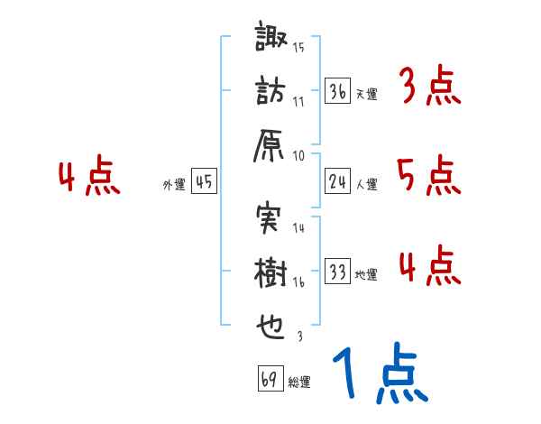 総運![]() | 諏訪原実樹也さんの総運は69画の1つ星!不満を感じやすい傾向が。ストレスを貯めないように注意しましょう。 あなたの人生を表す1番重要な運勢です。生涯を通じて影響する総合運となり、主に50歳以降の晩年期に影響を及ぼします。 |