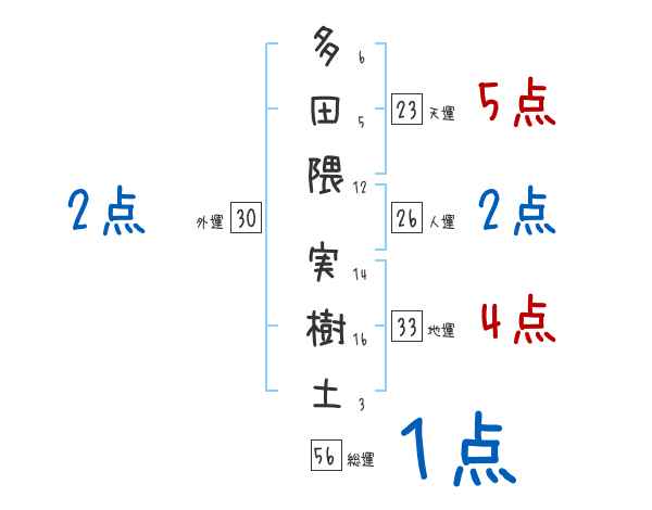 天運![]() | 多田隈実樹土さんの天運は23画の5つ星!想像力に優れ活力がある。一代で成功し名誉を手に入れる。 家系が持つ宿命的な運勢を表します。祖先から受け継いだ苗字ですので自分の力が及びません。家柄を象徴します。 |