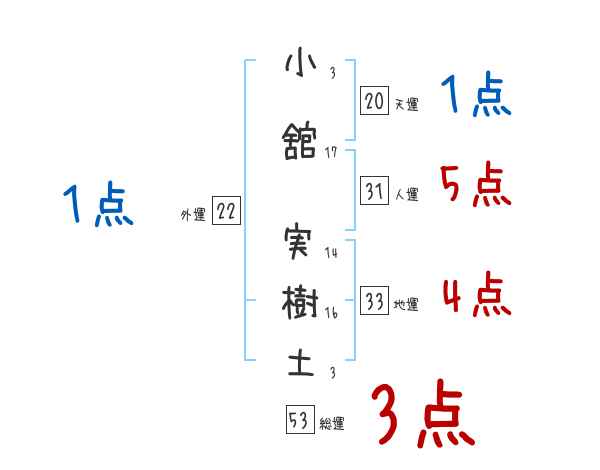 総運![]() | 小舘実樹土さんの総運は53画の3つ星!やや見栄っ張りで虚栄心がある。散財に注意。 あなたの人生を表す1番重要な運勢です。生涯を通じて影響する総合運となり、主に50歳以降の晩年期に影響を及ぼします。 |
