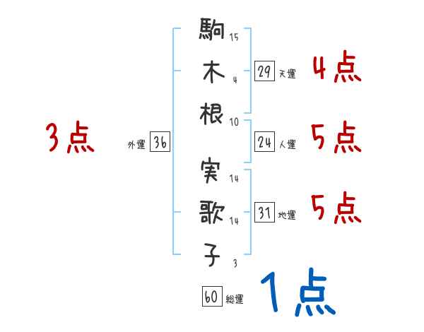 総運![]() | 駒木根実歌子さんの総運は60画の1つ星!悲観的で迷いやすい。波乱が多く損をしないように。 あなたの人生を表す1番重要な運勢です。生涯を通じて影響する総合運となり、主に50歳以降の晩年期に影響を及ぼします。 |