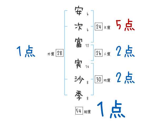 天運![]() | 安次富実沙季さんの天運は24画の5つ星!家庭運が良く順調な人生。金運にも恵まれる。 家系が持つ宿命的な運勢を表します。祖先から受け継いだ苗字ですので自分の力が及びません。家柄を象徴します。 |