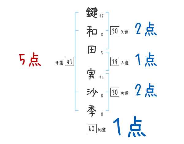 天運![]() | 鍵和田実沙季さんの天運は30画の2つ星!浮き沈みの激しさに注意しましょう。 家系が持つ宿命的な運勢を表します。祖先から受け継いだ苗字ですので自分の力が及びません。家柄を象徴します。 |