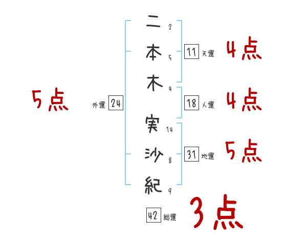 天運![]() | 二本木実沙紀さんの天運は11画の4つ星!着実に富や地位を得る幸運な人生。 家系が持つ宿命的な運勢を表します。祖先から受け継いだ苗字ですので自分の力が及びません。家柄を象徴します。 |