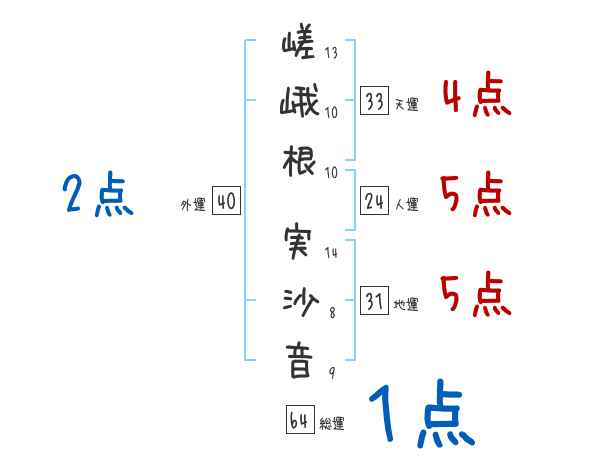 人運![]() | 嵯峨根実沙音さんの人運は24画の5つ星!家庭運が良く順調な人生。金運にも恵まれる。 性格や才能などを表す2番目に重要な運勢です。人間関係や協調性、社会的な成功に影響します。主に20歳から50歳ぐらいまでの中年期の運勢を表します。 |