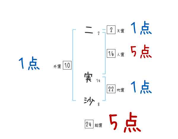 地運![]() | 二実沙さんの地運は22画の1つ星!努力することが苦手ないっぽう手先が器用。芸術性にも優れる。 個性を表す基礎的な運勢です。性格形成や対人関係、行動力など家庭環境に影響されます。主に誕生してから20歳くらいまでの若年期の運勢を表します。 |