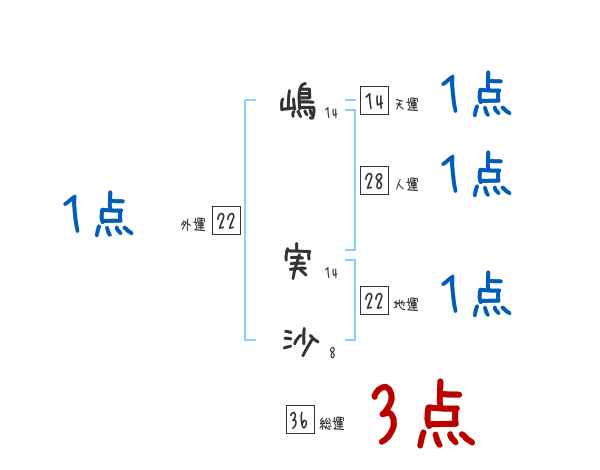 天運![]() | 嶋実沙さんの天運は14画の1つ星!人に対して優しいがストレスを溜め込みがち。人間関係のトラブルを避けるよう気をつけましょう。 家系が持つ宿命的な運勢を表します。祖先から受け継いだ苗字ですので自分の力が及びません。家柄を象徴します。 |