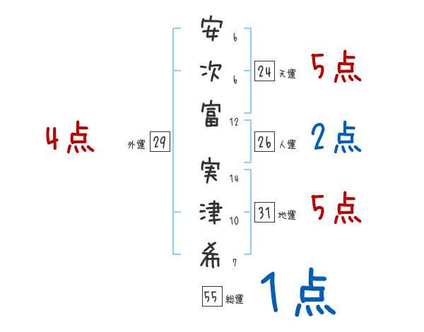 天運![]() | 安次富実津希さんの天運は24画の5つ星!家庭運が良く順調な人生。金運にも恵まれる。 家系が持つ宿命的な運勢を表します。祖先から受け継いだ苗字ですので自分の力が及びません。家柄を象徴します。 |