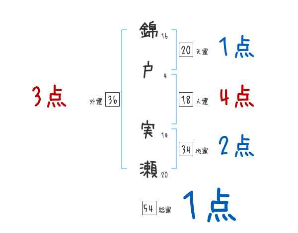 外運![]() | 錦戸実瀬さんの外運は36画の3つ星!先見性が豊かです。多少神経質で苦労することも。 生活面を象徴する運勢です。外部から受ける影響力を表し、結婚運、家庭運や職場、環境への順応性を表します。 |