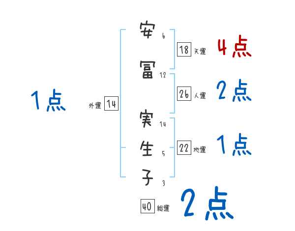 外運![]() | 安冨実生子さんの外運は14画の1つ星!人に対して優しいがストレスを溜め込みがち。人間関係のトラブルを避けるよう気をつけましょう。 生活面を象徴する運勢です。外部から受ける影響力を表し、結婚運、家庭運や職場、環境への順応性を表します。 |