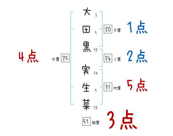 総運![]() | 大田黒実生菜さんの総運は51画の3つ星!変化が激しく、危険に注意。堅実な性格。 あなたの人生を表す1番重要な運勢です。生涯を通じて影響する総合運となり、主に50歳以降の晩年期に影響を及ぼします。 |