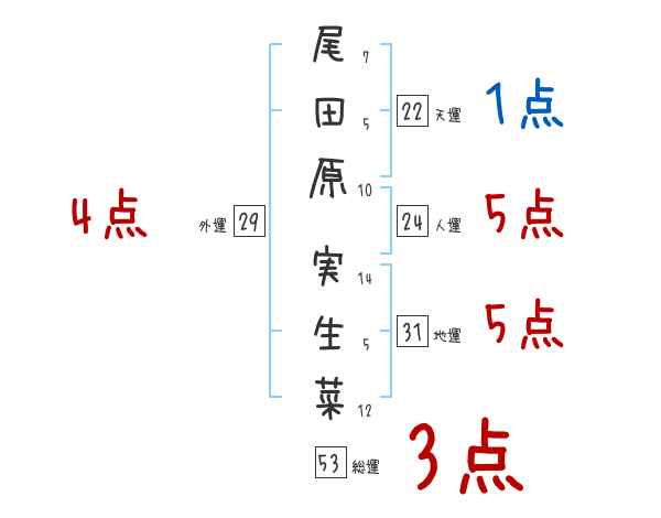 総運![]() | 尾田原実生菜さんの総運は53画の3つ星!やや見栄っ張りで虚栄心がある。散財に注意。 あなたの人生を表す1番重要な運勢です。生涯を通じて影響する総合運となり、主に50歳以降の晩年期に影響を及ぼします。 |