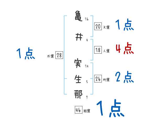 外運![]() | 亀井実生那さんの外運は28画の1つ星!家庭環境に注意。スポーツで活躍できる能力があるかも。 生活面を象徴する運勢です。外部から受ける影響力を表し、結婚運、家庭運や職場、環境への順応性を表します。 |