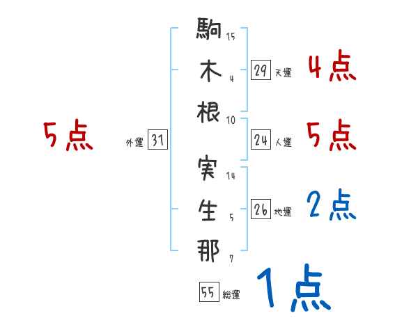 天運![]() | 駒木根実生那さんの天運は29画の4つ星!完全主義で才能がある。厳格な心の持ち主。 家系が持つ宿命的な運勢を表します。祖先から受け継いだ苗字ですので自分の力が及びません。家柄を象徴します。 |