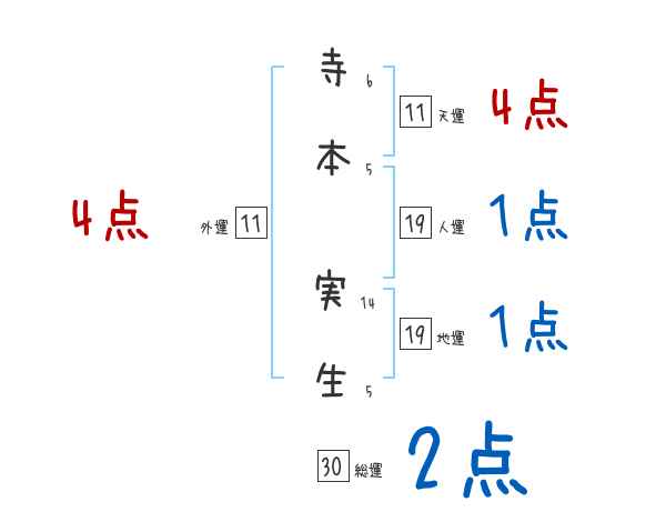 天運![]() | 寺本実生さんの天運は11画の4つ星!着実に富や地位を得る幸運な人生。 家系が持つ宿命的な運勢を表します。祖先から受け継いだ苗字ですので自分の力が及びません。家柄を象徴します。 |