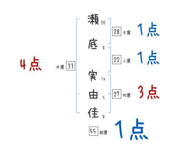 外運![]() | 瀬底実由佳さんの外運は33画の4つ星!権力志向でプライドが高い。勇気があり運を切り開き成功する。 生活面を象徴する運勢です。外部から受ける影響力を表し、結婚運、家庭運や職場、環境への順応性を表します。 |