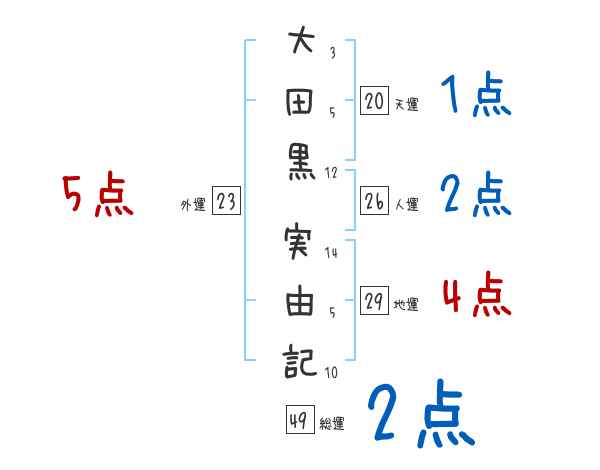 人運![]() | 大田黒実由記さんの人運は26画の2つ星!波瀾万丈かも。信頼できる人を大事にしましょう。 性格や才能などを表す2番目に重要な運勢です。人間関係や協調性、社会的な成功に影響します。主に20歳から50歳ぐらいまでの中年期の運勢を表します。 |