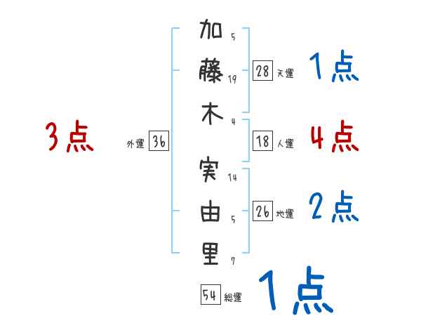 天運![]() | 加藤木実由里さんの天運は28画の1つ星!家庭環境に注意。スポーツで活躍できる能力があるかも。 家系が持つ宿命的な運勢を表します。祖先から受け継いだ苗字ですので自分の力が及びません。家柄を象徴します。 |