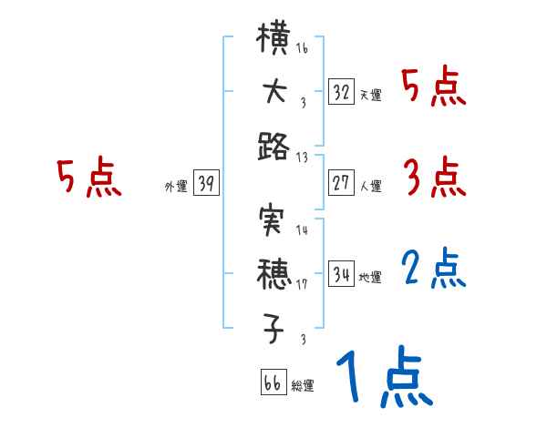 外運![]() | 横大路実穂子さんの外運は39画の5つ星!社交性に優れ人望が厚い。人の上に立ち成功する。 生活面を象徴する運勢です。外部から受ける影響力を表し、結婚運、家庭運や職場、環境への順応性を表します。 |