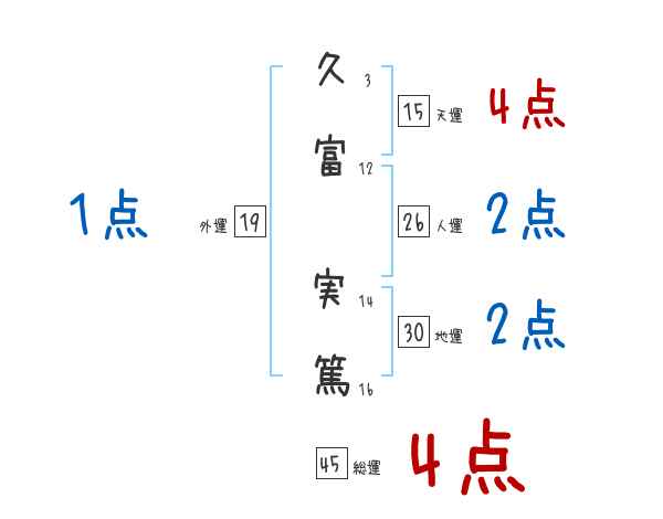 外運![]() | 久富実篤さんの外運は19画の1つ星!優れた才能を持ちますが、協調性が足りないことも。周りの人と協力する事を意識しましょう。 生活面を象徴する運勢です。外部から受ける影響力を表し、結婚運、家庭運や職場、環境への順応性を表します。 |
