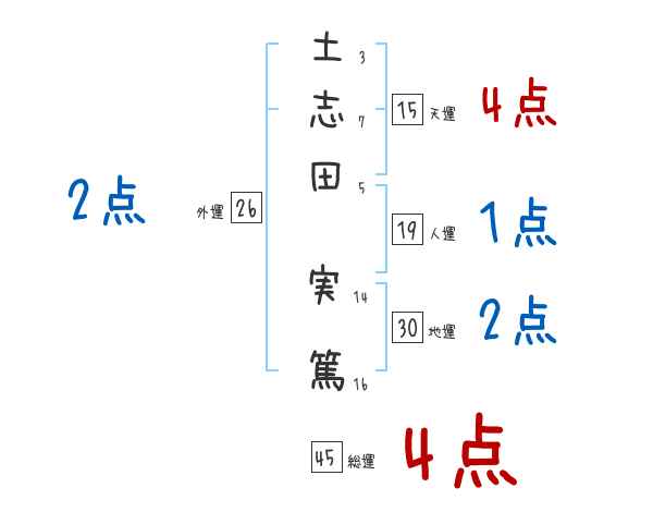 外運![]() | 土志田実篤さんの外運は26画の2つ星!波瀾万丈かも。信頼できる人を大事にしましょう。 生活面を象徴する運勢です。外部から受ける影響力を表し、結婚運、家庭運や職場、環境への順応性を表します。 |