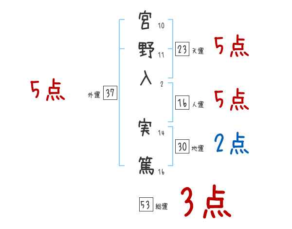 総運![]() | 宮野入実篤さんの総運は53画の3つ星!やや見栄っ張りで虚栄心がある。散財に注意。 あなたの人生を表す1番重要な運勢です。生涯を通じて影響する総合運となり、主に50歳以降の晩年期に影響を及ぼします。 |