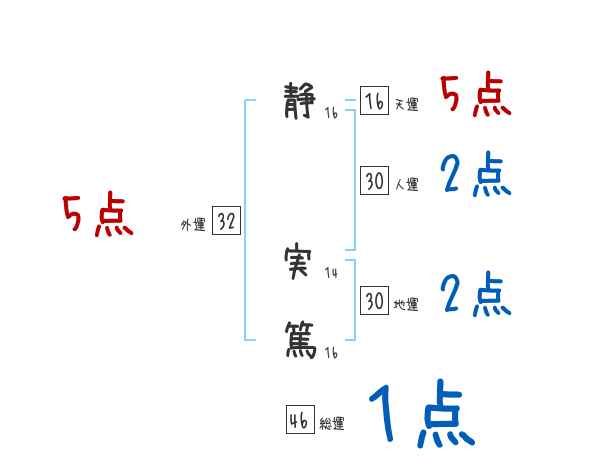 外運![]() | 静実篤さんの外運は32画の5つ星!柔軟性があり成功する。チャンスが多く金運が良い。 生活面を象徴する運勢です。外部から受ける影響力を表し、結婚運、家庭運や職場、環境への順応性を表します。 |