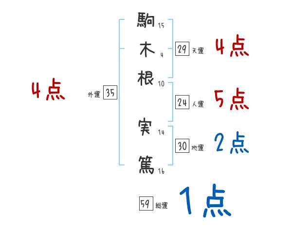 外運![]() | 駒木根実篤さんの外運は35画の4つ星!温厚な性格で感受性が高い。穏和な性格で人望が厚い。 生活面を象徴する運勢です。外部から受ける影響力を表し、結婚運、家庭運や職場、環境への順応性を表します。 |