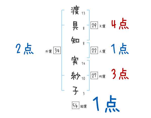外運![]() | 渡具知実紗子さんの外運は34画の2つ星!独創性に優れるが、自尊心が強く災難に注意しましょう。 生活面を象徴する運勢です。外部から受ける影響力を表し、結婚運、家庭運や職場、環境への順応性を表します。 |