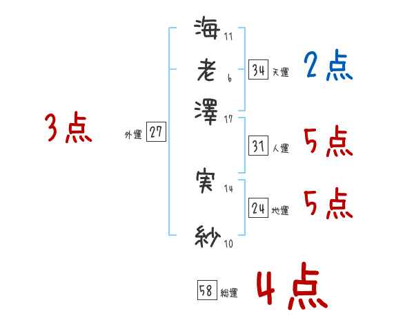 天運![]() | 海老澤実紗さんの天運は34画の2つ星!独創性に優れるが、自尊心が強く災難に注意しましょう。 家系が持つ宿命的な運勢を表します。祖先から受け継いだ苗字ですので自分の力が及びません。家柄を象徴します。 |
