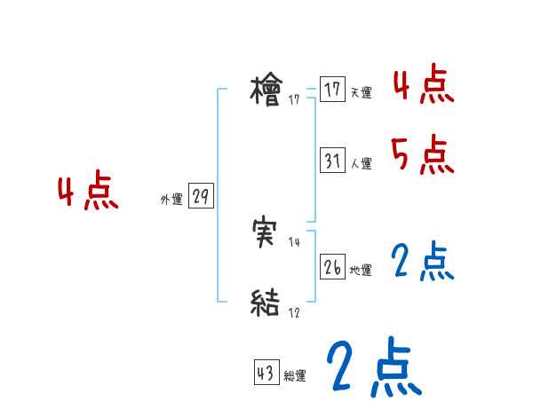 総運![]() | 檜実結さんの総運は43画の2つ星!頑固な性格で独立心が強いかも。やや非現実的で浪費に注意しましょう。 あなたの人生を表す1番重要な運勢です。生涯を通じて影響する総合運となり、主に50歳以降の晩年期に影響を及ぼします。 |