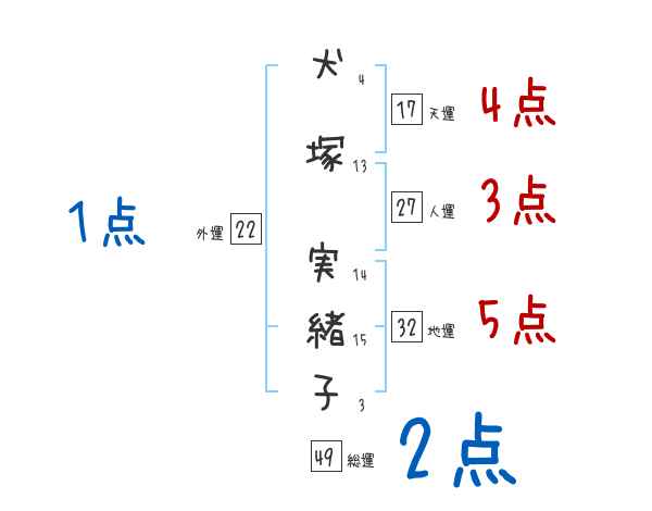 外運![]() | 犬塚実緒子さんの外運は22画の1つ星!努力することが苦手ないっぽう手先が器用。芸術性にも優れる。 生活面を象徴する運勢です。外部から受ける影響力を表し、結婚運、家庭運や職場、環境への順応性を表します。 |