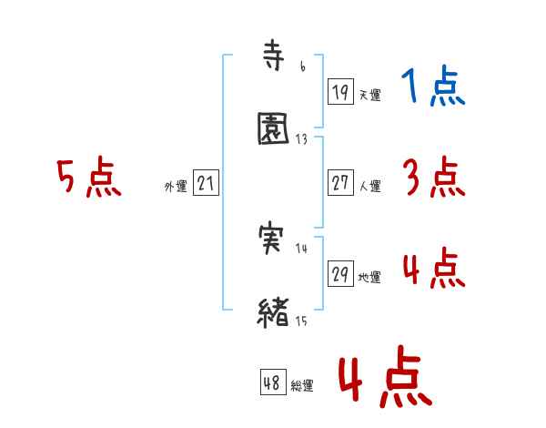 天運![]() | 寺園実緒さんの天運は19画の1つ星!優れた才能を持ちますが、協調性が足りないことも。周りの人と協力する事を意識しましょう。 家系が持つ宿命的な運勢を表します。祖先から受け継いだ苗字ですので自分の力が及びません。家柄を象徴します。 |