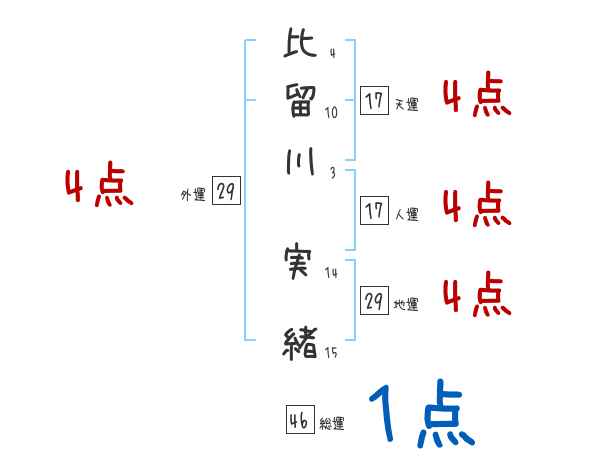 総運![]() | 比留川実緒さんの総運は46画の1つ星!迷走することが多く苦労するかも。目先のことにとらわれないように。 あなたの人生を表す1番重要な運勢です。生涯を通じて影響する総合運となり、主に50歳以降の晩年期に影響を及ぼします。 |