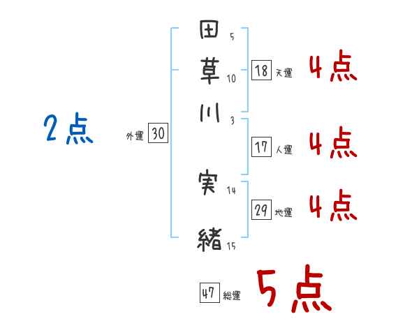 総運![]() | 田草川実緒さんの総運は47画の5つ星!実力が開花し発展する円満な人生。財に恵まれる。 あなたの人生を表す1番重要な運勢です。生涯を通じて影響する総合運となり、主に50歳以降の晩年期に影響を及ぼします。 |