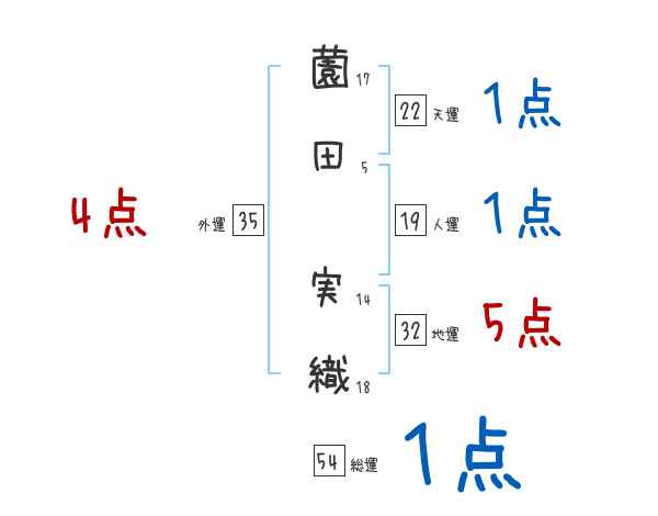 外運![]() | 薗田実織さんの外運は35画の4つ星!温厚な性格で感受性が高い。穏和な性格で人望が厚い。 生活面を象徴する運勢です。外部から受ける影響力を表し、結婚運、家庭運や職場、環境への順応性を表します。 |