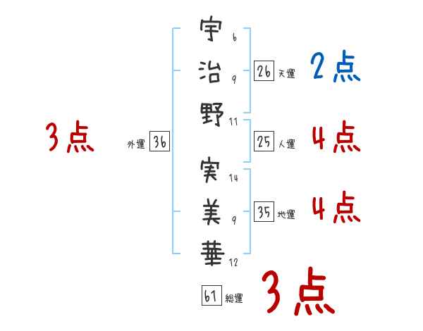 天運![]() | 宇治野実美華さんの天運は26画の2つ星!波瀾万丈かも。信頼できる人を大事にしましょう。 家系が持つ宿命的な運勢を表します。祖先から受け継いだ苗字ですので自分の力が及びません。家柄を象徴します。 |
