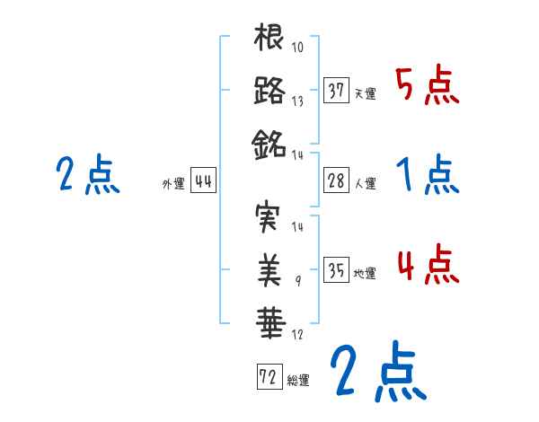 総運![]() | 根路銘実美華さんの総運は72画の2つ星!災難が多く不安定な生活にならないように注意。明暗のある人生かも。 あなたの人生を表す1番重要な運勢です。生涯を通じて影響する総合運となり、主に50歳以降の晩年期に影響を及ぼします。 |