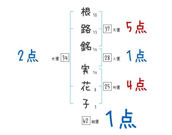 外運![]() | 根路銘実花子さんの外運は34画の2つ星!独創性に優れるが、自尊心が強く災難に注意しましょう。 生活面を象徴する運勢です。外部から受ける影響力を表し、結婚運、家庭運や職場、環境への順応性を表します。 |