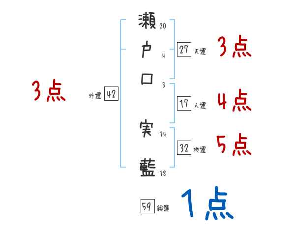 外運![]() | 瀬戸口実藍さんの外運は42画の3つ星!病気に注意。多芸であるが消極的でおとなしい。 生活面を象徴する運勢です。外部から受ける影響力を表し、結婚運、家庭運や職場、環境への順応性を表します。 |