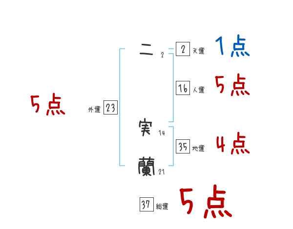 総運![]() | 二実蘭さんの総運は37画の5つ星!努力家で順応性に優れる。現実的な考え方ができ忠実に物事をこなす。 あなたの人生を表す1番重要な運勢です。生涯を通じて影響する総合運となり、主に50歳以降の晩年期に影響を及ぼします。 |