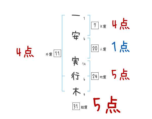 天運![]() | 一安実行木さんの天運は7画の4つ星!強い意志や信念を持ち独立心が強い。自立する。 家系が持つ宿命的な運勢を表します。祖先から受け継いだ苗字ですので自分の力が及びません。家柄を象徴します。 |