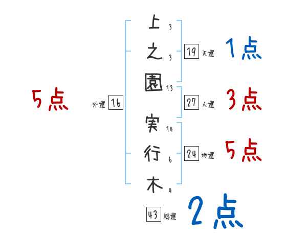 天運![]() | 上之園実行木さんの天運は19画の1つ星!優れた才能を持ちますが、協調性が足りないことも。周りの人と協力する事を意識しましょう。 家系が持つ宿命的な運勢を表します。祖先から受け継いだ苗字ですので自分の力が及びません。家柄を象徴します。 |