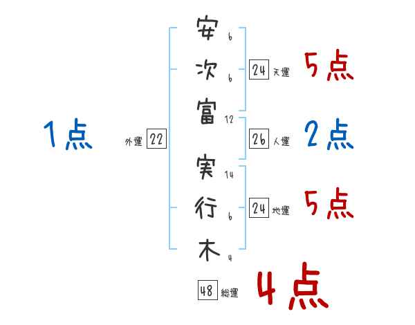 天運![]() | 安次富実行木さんの天運は24画の5つ星!家庭運が良く順調な人生。金運にも恵まれる。 家系が持つ宿命的な運勢を表します。祖先から受け継いだ苗字ですので自分の力が及びません。家柄を象徴します。 |