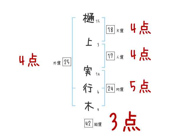 天運![]() | 樋上実行木さんの天運は18画の4つ星!情熱的で剛気。忍耐力があり信頼される。 家系が持つ宿命的な運勢を表します。祖先から受け継いだ苗字ですので自分の力が及びません。家柄を象徴します。 |
