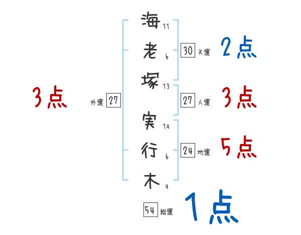 天運![]() | 海老塚実行木さんの天運は30画の2つ星!浮き沈みの激しさに注意しましょう。 家系が持つ宿命的な運勢を表します。祖先から受け継いだ苗字ですので自分の力が及びません。家柄を象徴します。 |